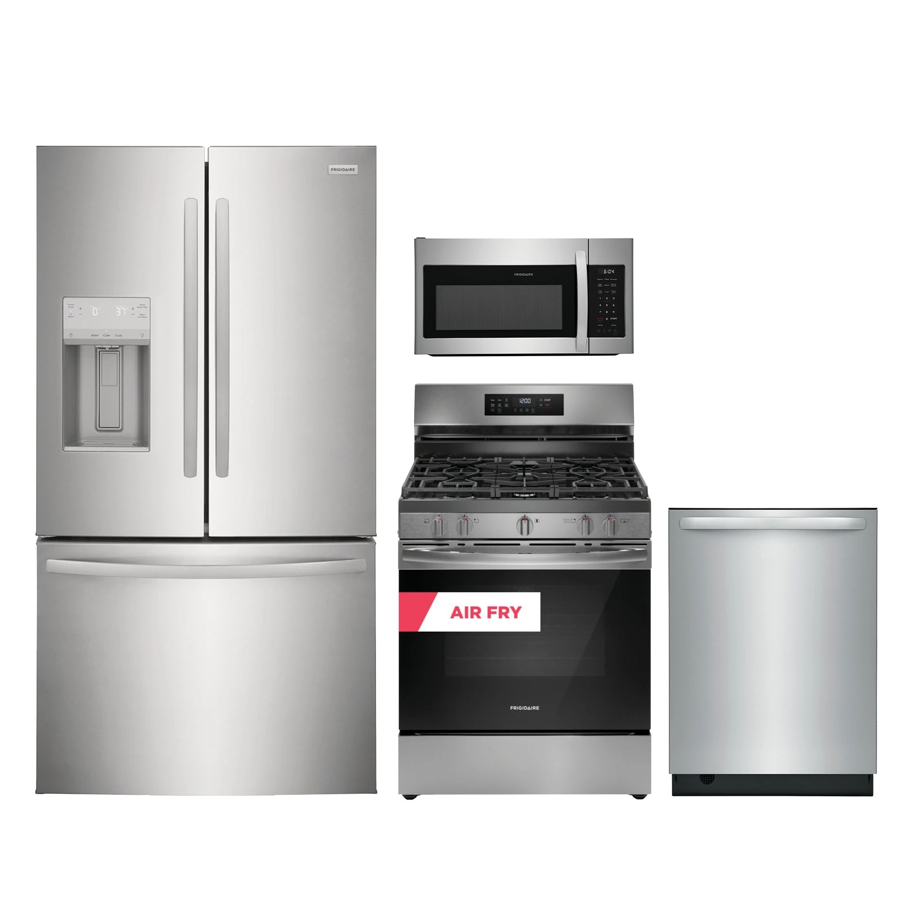 This 4pc Frigidaire package includes the FRFS2823AS 27.8 cu.ft. French Door refrigerator, FCRG3083AS freestanding gas range w/ air fry , FMOS1846BS over the range (OTR) microwave, and FDSH4501AS towel handle 3rd rack dishwasher w/ stainless steel interior and hidden top controlsRead More