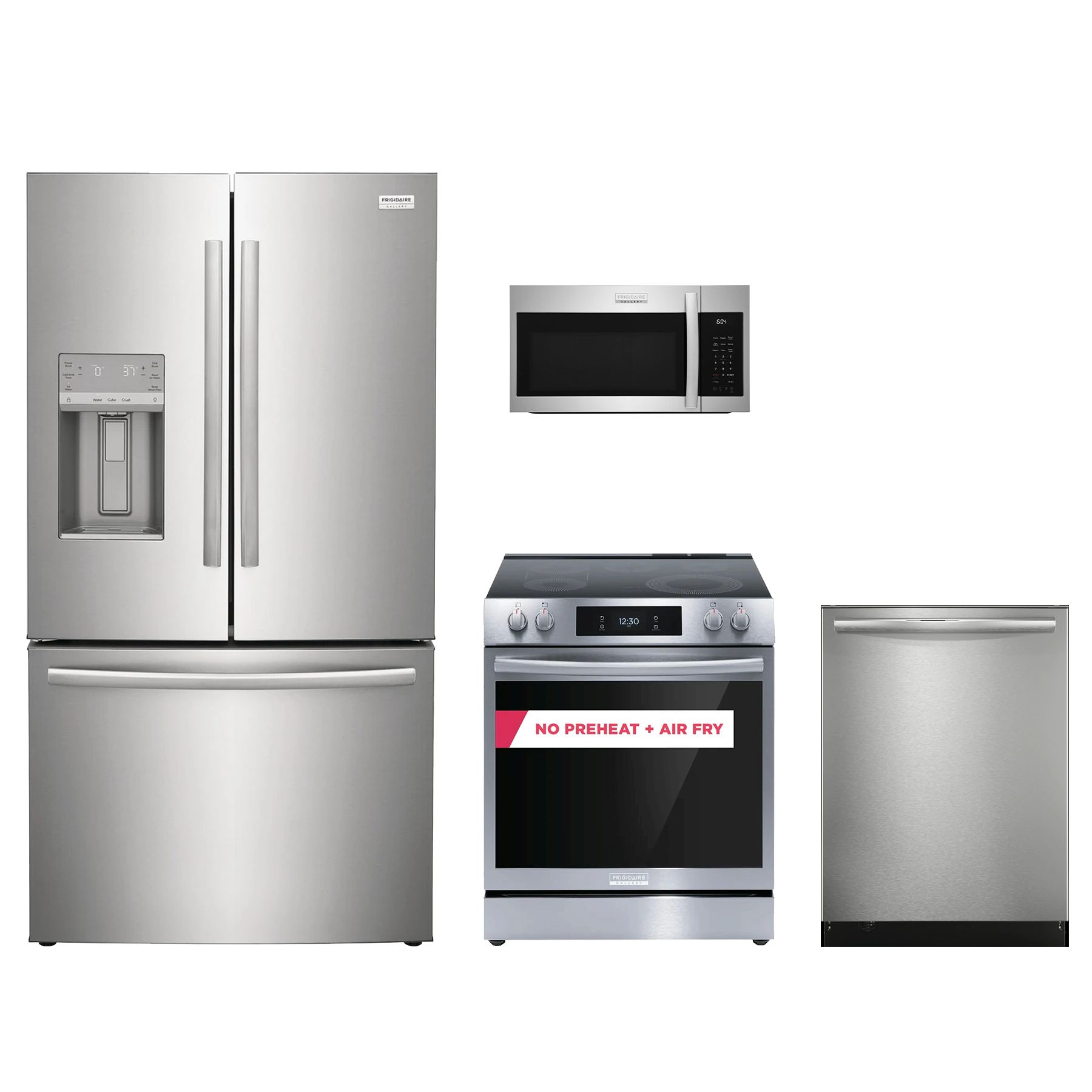 This 4pc Frigidaire Gallery package includes the GRFS2853AF 27.8 cu.ft. French Door refrigerator, GCFE3060BF freestanding slide-in electric range w/ air fry , GMOS1962AF over the range (OTR) microwave, and GDSH4715AF towel handle 3rd rack dishwasher w/ stainless steel interior and hidden top controlsRead More