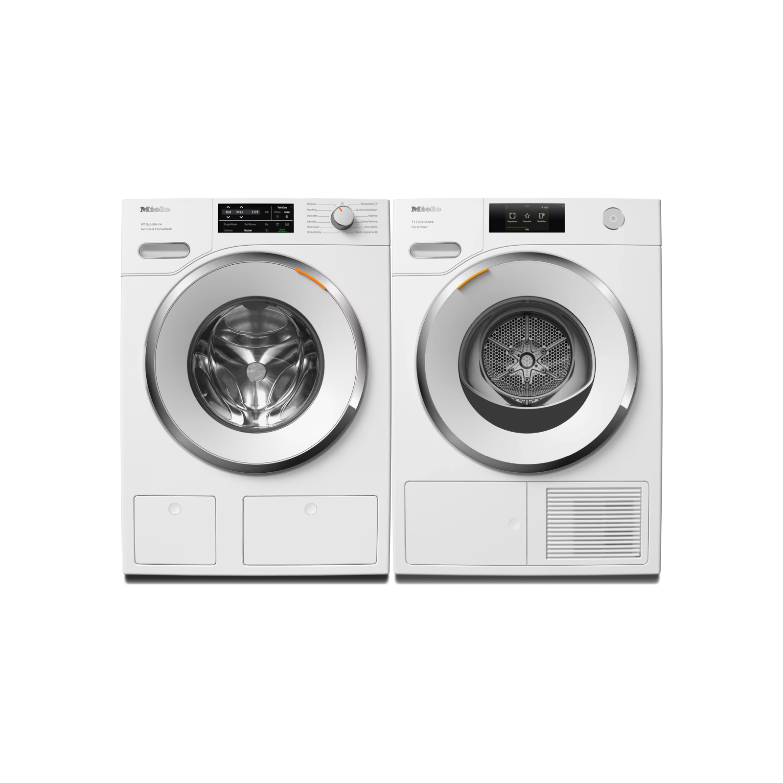 This Miele compact laundry pair includes the WXI 860 WCS W1 W1 Front-loading washing machine with TwinDos, IntenseWash, and Miele@home and TXR860WP T1 Heat-pump tumble dryer with Miele@home and SteamFinishRead More