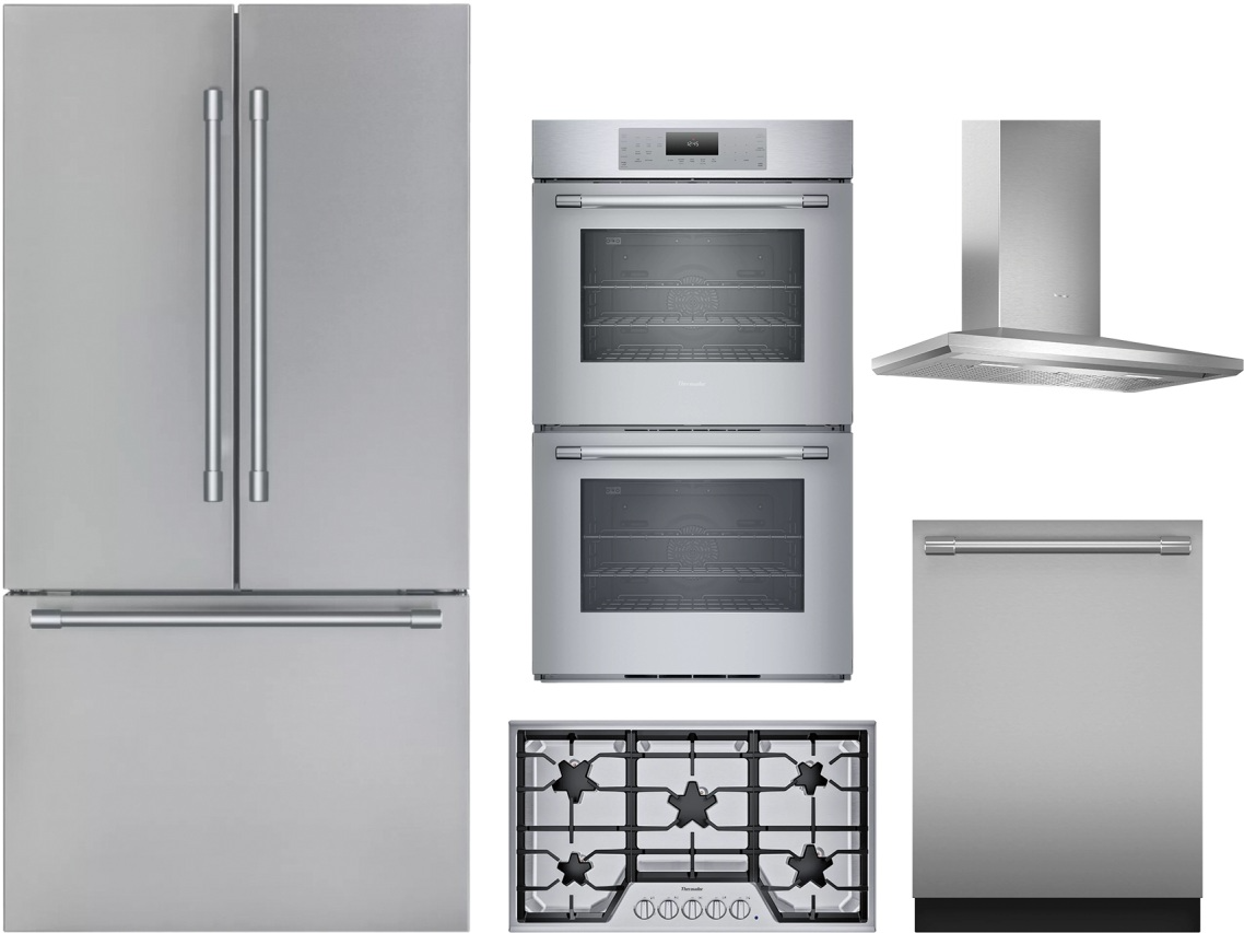 Thermador® 5 Piece Stainless Steel Kitchen Package with a French door refrigerator, double electric wall oven, gas cooktop, built in dishwasher, and wall mounted range hood.Read More